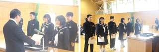 私は,「ただ今任命された6人の級長・副級長の皆さん,大変なこともあるでしょうが,クラスのため,仲間のために,持てる力を精一杯発揮してください。級長・副級長を支えるクラスの皆さんは,『大変なことは級長・副級長に任せた。』という気持ちでは,良いクラスをつくることはできません。皆さんが,級長・副級長と同じ決意で,今日からまた学校生活を送ってほしいと願っています。」と語りました。