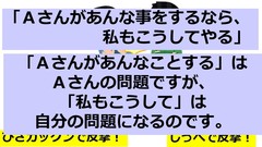 でも、「Aさんがあんな事をするなら、私もこうしてやる」と言う人がいます。さっきの反撃と同じですよね。気持ちはよく分かりますが、おかしいですね。「Aさんがあんなことする」はAさんの問題ですが、「私もこうして」は自分の問題になるんですから。せっかく自分は問題なく生活していたのに、わざわざ自分を問題の中に落とそうというのです。こんなバカバカしい話があるでしょうか?しかも、相手と同レベルの「悪いこと」を、自分にもさせようという話です。相手が汚いから、自分も汚くなってやろう。相手がズルいから、自分もズルしてやろう。相手が乱暴だから、自分も乱暴してやろう・・・それこそ、あわれで不幸な話です。 私たちは、自分がどんな人間になりいのかを、それだけを問題にすればよいのです。ズルい人を見たら、じゃあ自分はどんな人間でありたいのか。人を攻撃する人を見たら、じゃあ自分はどんな人間でありたいのか・・・。相手が何をしたかで、自分の生き方まで変わっちゃったらおかしいですよね。 世界を見渡すと、国のトップの人が、「相手がこうするから、俺たちもこうする」とやっていますよね。おかしいですし、解決に向かっていくとは到底思えません。あなたたちが、これからの世界をリードしていきます。あなたが、どんな人でありたいか、どんな日本でありたいかをしっかり考えて、平和な社会を作っていって欲しいのです。そのためには、今身近にいる仲間に対して、自分のとっている行動を考えることから始まります。みんなで、さらに素敵な清里中を作っていきましょうね。