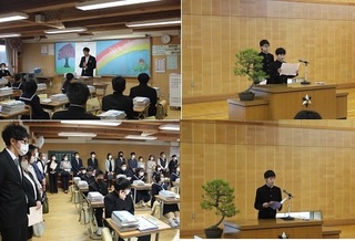 <令和5年度新任式・始業式> 2年生・3年生の拍手の中、転入職員が温かく迎えられました。続いて1学期始業式では、それぞれの学年2名の代表者が、これから取り組んでいく目標を堂々と発表してくれました。とても頼もしく感じました。