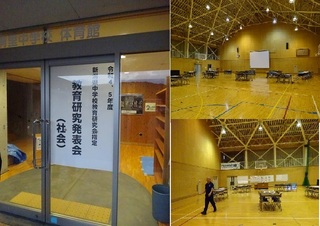 <明日の準備> 明日は中教研社会科の上越地区研究会が体育館で行われます。体育館は放課後机をセッティングし、3年生の発表に備えての掲示が行われました。 市内外から中学校、小学校の先生方がおよそ60名ほど来校される予定です。「清里の未来」への政策を発表していきます。 はつらつと、さわやかに!来校者の皆さんを迎えましょう。