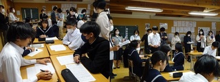 突風で玄関外にあるマットが飛んでいきました。(一人でもてない大きさ・重さです)その風の中、果敢に自転車で登校する生徒がいました。 <支援訪問> 2時間目にあたる「峠」の授業です。教育委員会より中村博子先生からお越しいただき、ご指導をいただきました。