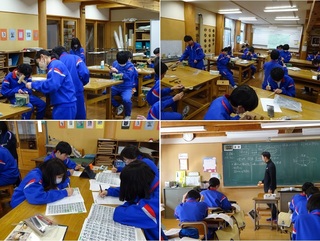 朝、晴れているのに霧雨が降ってました。がりがりした雪の塊があると思わず踏みたくなってしまいます。 <授業風景 その1> 上段 2年:国語 「国語の力を伸ばすため」の力について、2つのチームに分けて、2学期学習した題材を振り返っているところです。みんなニコニコとても楽しそうな様子に思わず引き込まれて写真を撮りました。 下段 1年、3年:数学 1年生は垂直二等分線、3年生は円周角の定理とどちらも図形分野の内容でした。コンパスをうまく使って作図するのは、学年が上がるごとにうまくなっていくようです。3年生のノート、とても見やすくてさすが!です。