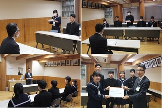 10月の中教研社会科の発表時に5つの政策をまとめました。今日は、清里区総合事務所長 佐藤所長様からおいでいただき、代表5名が提案書を手渡しました。