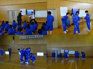 <体育祭ガイダンス> 各軍に分かれての仲間づくりです。ウエスタンチャレンジでは、ピストルに見立てて出した指の数を合計したのを早くいった方が勝ち!早打ちではないのですが、パッと見てすぐ計算するのと、口で数を言うのがつながらず苦戦している人もいました。 次に輪くぐりです。人数÷2が目指すタイム(秒)。どうやったら早くくぐれるのか、知恵を出し合います。これがなかなか面白く、15秒の壁が立ちふさがって崩れません。いろいろ試している姿が面白く、周りは大笑いに包まれました。