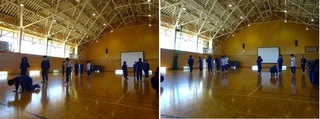 <軍練習> 青軍:男女に分かれて3年生が教えていました。事前に動画が配信されていて、それを見て・・・来てくれるといいんだよと3年生。
