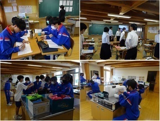3年:道徳、英語 道徳は実習生の授業です。「平和への願い」オバマ大統領が広島の平和記念公園を訪れたことに触れています。戦争が身近だったのは過去のこと・・といえない現在、世界で起こっている紛争や戦争を他人事として思わず、平和に向けて何ができるのか考えていきたいですね。 1年:家庭 フェルトを使ってミシンで小物づくりです。ボタン付けをするのに玉結びができなくて苦戦していました。 ペン入れやポケットティシュを入れたりできる小物ができました。