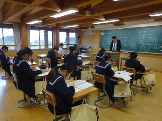 三連休が終わって、雨となりました。木々の色づきも濃くなってきました。<授業風景> 2年:国語 平家物語の音読。1年生の時の竹取物語に比べると、原文で書いてある部分が多くなり、「扇のまと」の那須与一が矢を射る描写はすらすら読むには、練習が必要です。